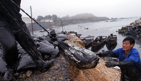 2010年7月21日,大連新港南海碼頭,漁民在清理油污。7月16日,大連新港輸油管道發生起火爆炸,事故造成大量原油泄漏海上。