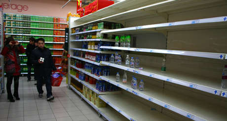 2014年5月18日中午,浙江富陽,記者來到當地的沃爾瑪超市,大批市民涌入超市急購瓶裝飲用水,大批貨柜上的礦泉水被搶購一空。富陽市人民政府18日發布通告,稱7時接杭州市環保局和桐廬縣環保局通報,桐廬縣發生運輸車側翻泄漏事故,部分四氯乙烷泄漏至富春江。富陽市政府決定,富春江沿線各取水單位暫停從富春江取水,從12時起暫停自來水供應。