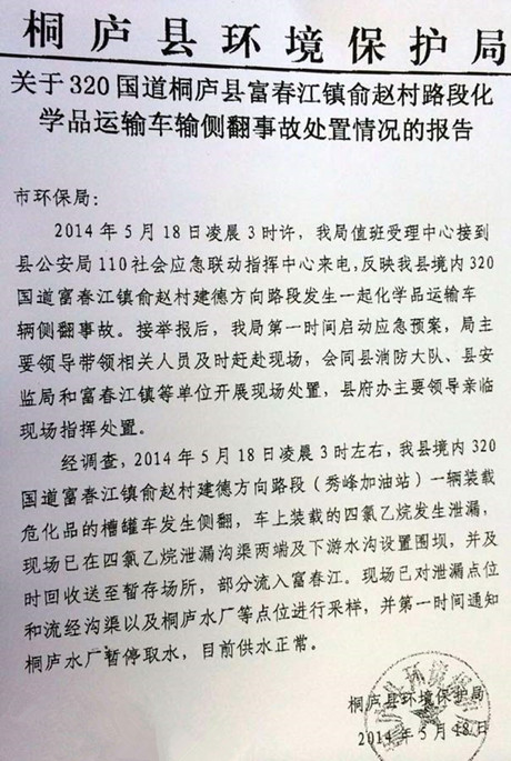2014年5月18日中午,浙江富陽,記者來到當地的沃爾瑪超市,大批市民涌入超市急購瓶裝飲用水,大批貨柜上的礦泉水被搶購一空。富陽市人民政府今日發布通告,稱7時接杭州市環保局和桐廬縣環保局通報,桐廬縣發生運輸車側翻泄漏事故,部分四氯乙烷泄漏至富春江。富陽市政府決定,富春江沿線各取水單位暫停從富春江取水,從12時起暫停自來水供應。