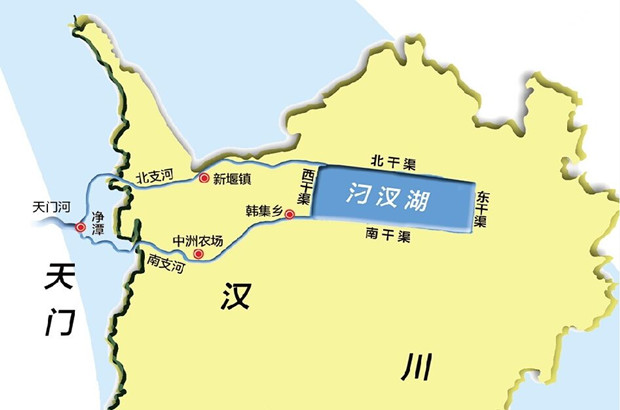 ?汊湖,面積12萬畝,是我省第五大湖泊,也是全省最大的封閉式湖泊,四周被人造干渠環繞。其水源除雨水外,主要為上游天門河來水。天門河在天門市凈潭鄉分為南、北兩支注入?汊湖,其中南支河流入漢川市新河口進入?汊湖南干渠;北支河流入漢川市新堰鎮進入?汊湖北干渠,最終匯入漢江。