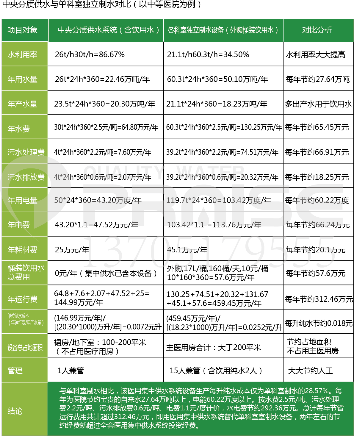 以中等醫(yī)院為例,采用中央分質(zhì)供水與單科室獨(dú)立制水對(duì)比:該醫(yī)用集中供水系統(tǒng)設(shè)備生產(chǎn)每升純水成本僅為單科室制水的28.57%。每年為醫(yī)院節(jié)約寶貴的自來(lái)水27.64萬(wàn)噸以上,電能60.22萬(wàn)度以上。按水費(fèi)2.5元/噸、污水處理費(fèi)2.2元/噸、污水排放費(fèi)0.6元/噸、電費(fèi)1.1元/度計(jì)價(jià),水電費(fèi)節(jié)約292.36萬(wàn)元。總計(jì)每年節(jié)省運(yùn)行費(fèi)用共計(jì)超過(guò)312.46萬(wàn)元,即用醫(yī)用集中供水系統(tǒng)替代單科室室制水設(shè)備,兩年左右的節(jié)約經(jīng)費(fèi)就超過(guò)全套醫(yī)用集中供水系統(tǒng)投資經(jīng)費(fèi)。